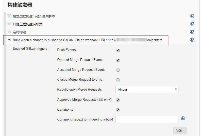 任务的构建触发器选项下,选中Build when a change in pushed to GitLab,把这行中的URL复制下来,后面GitLab配置中会用到。